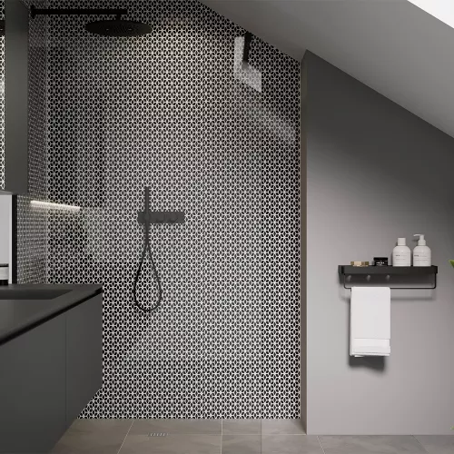 Interior trends are alive with this confident design; have some creative fun, injecting energy into your bathroom by using this exciting geometric pattern to give a contemporary retro feel. Keep the decor minimal to complement the look.