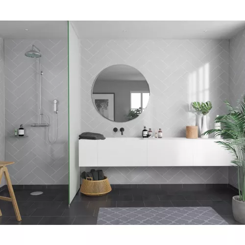 A lighter, high gloss grey in this super trendy Herringbone tile design. Delivers a classy and modern look in any room. Product code: 4115-M72.