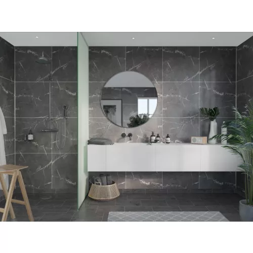 This design is a modern marble effect. Its bold and classy, and adds a touch of sophistication to any bathroom. The 60 x 60 cm tile effect makes this decor look great as a whole room covering or a feature wall. Product code: 2272-M6060.