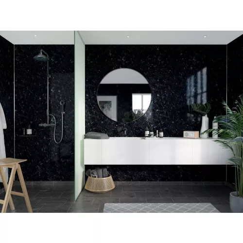 This decor has a deep, black marble design to it. With it’s glossy finish and classic grey flecks it is both decorative and stylish.